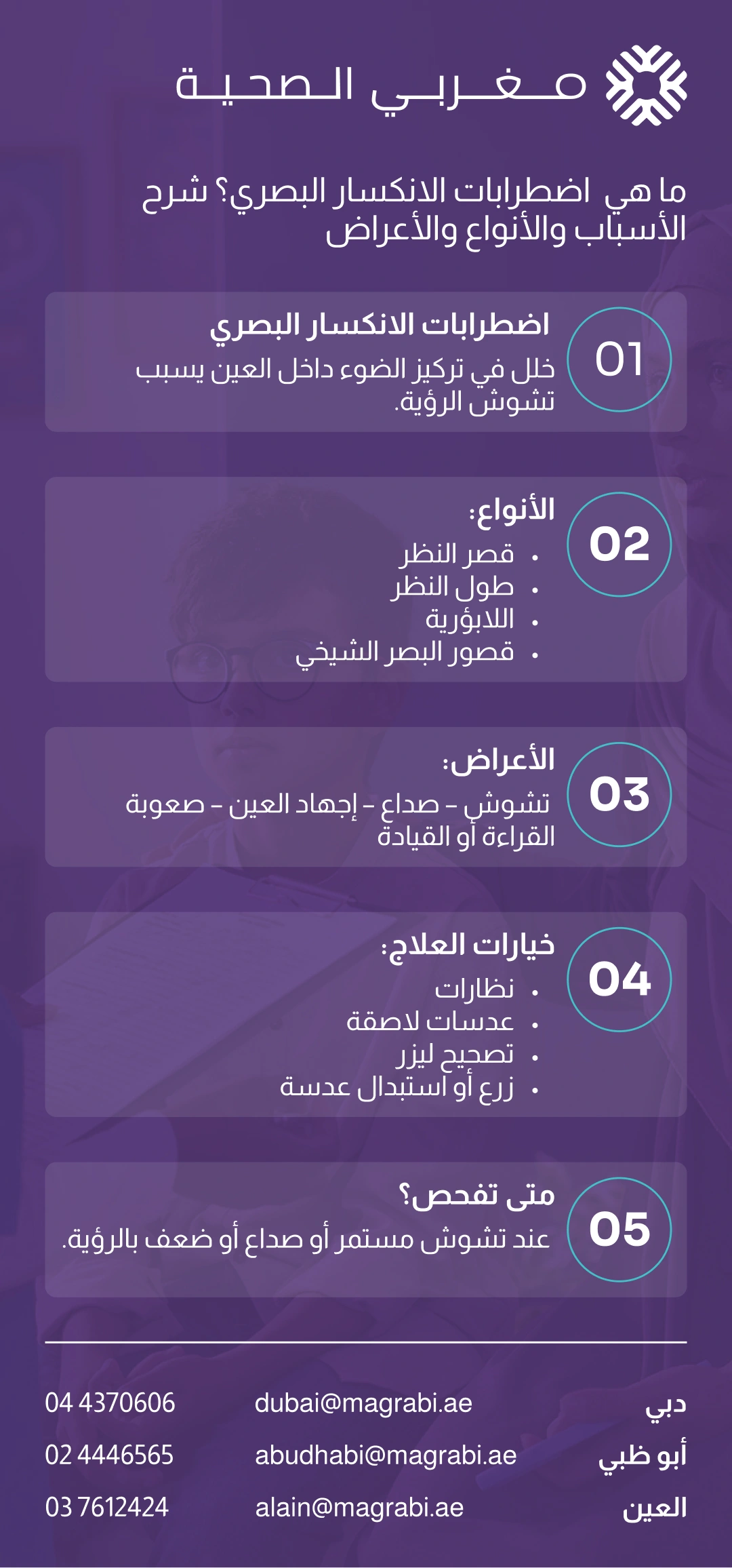 تُعدّ اضطرابات الانكسار البصري من أكثر مشكلات الإبصار شيوعًا، وهي تؤدي إلى تشوش أو ضبابية الرؤية عندما تعجز العين عن تركيز الضوء بشكل صحيح على الشبكية. وتشمل قصر النظر (الحسر)، وطول النظر (المدّ)، واللابؤرية (الاستجماتيزم)، وقصور البصر الشيخي (شيخوخة النظر)، ويمكن أن تصيب الأطفال والبالغين في مراحل عمرية مختلفة.