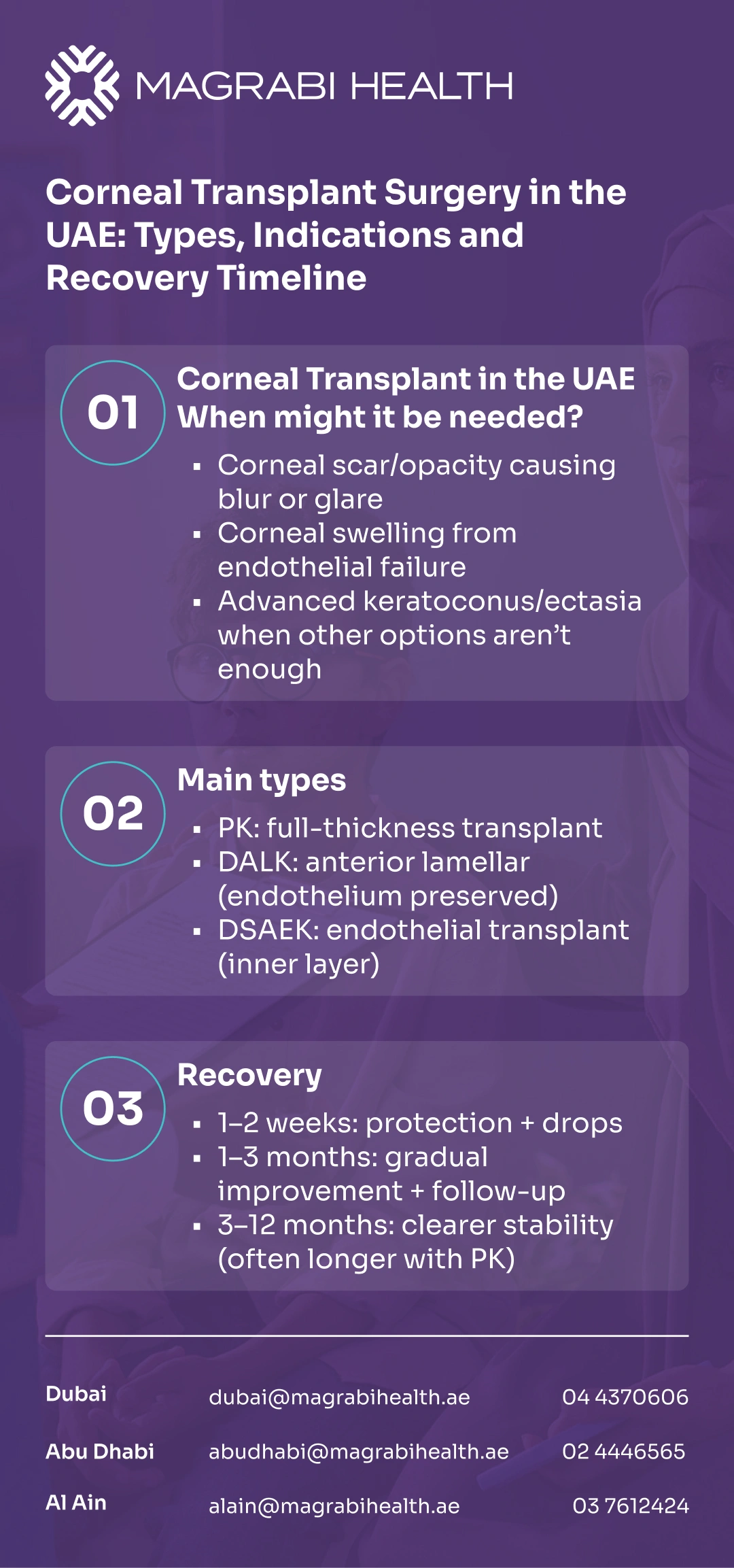 If you’re considering corneal transplant surgery, book a consultation at Magrabi Health Hospitals in the UAE to review your corneal maps and discuss cornea graft types, risks, and a realistic recovery timeline.