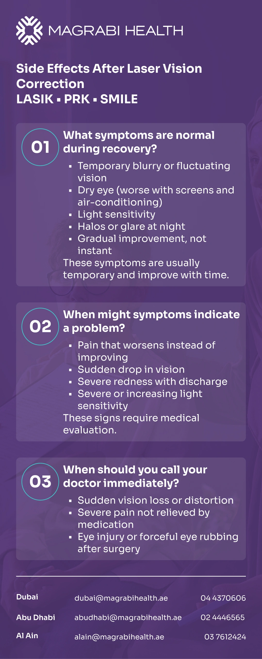 If you’re recovering from refractive surgery or have concerns about ongoing side effects, book a consultation at Magrabi Health Hospitals in the UAE to review your eye health, clarify what’s normal, and discuss appropriate next steps for your recovery.