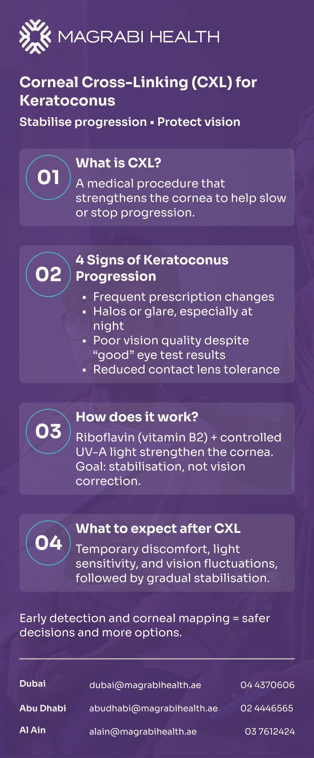 For an overview of keratoconus assessment and CXL eligibility, visit the Refractive and Cornea Care service page on the Magrabi Health website.