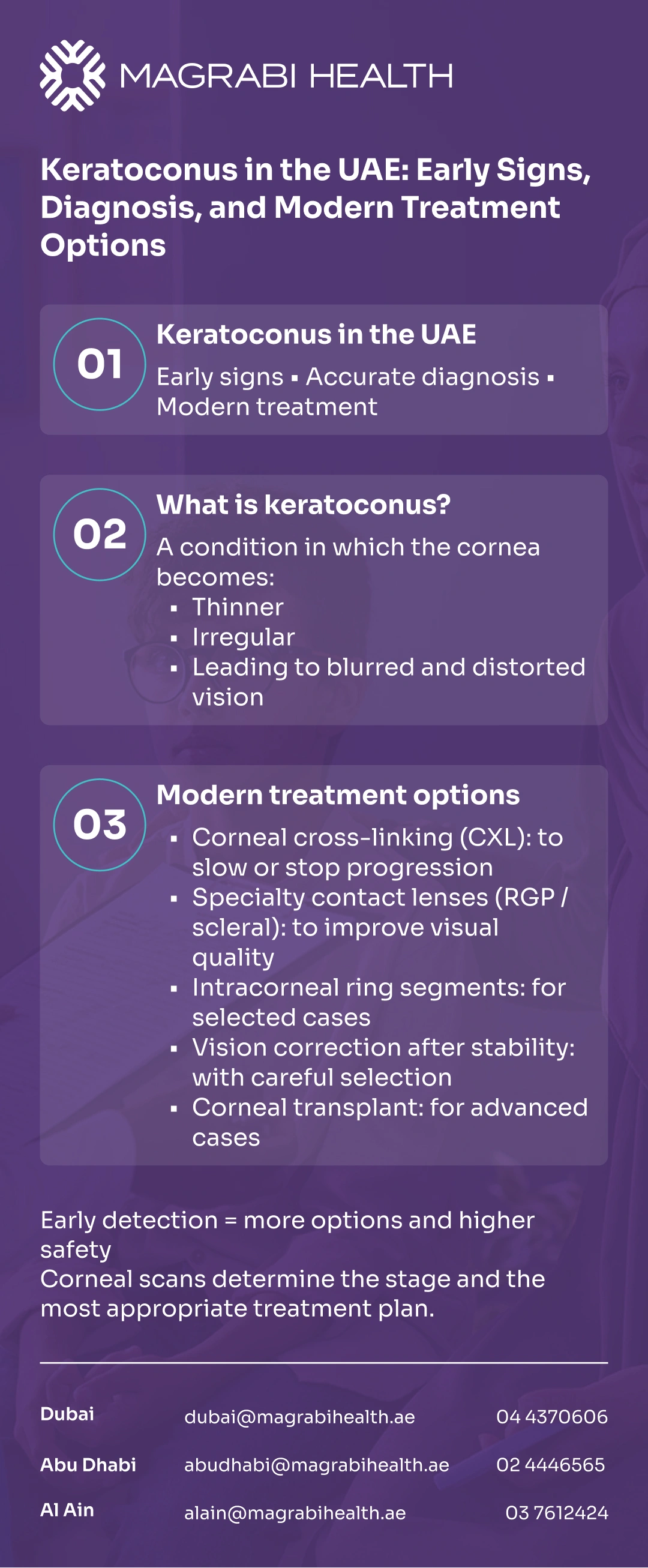 Concerned about progression or night-driving glare? Book an eye consultation at one of Magrabi Health’s hospital branches in the UAE—Dubai, Abu Dhabi, or Al Ain to review your scans and discuss a practical plan.